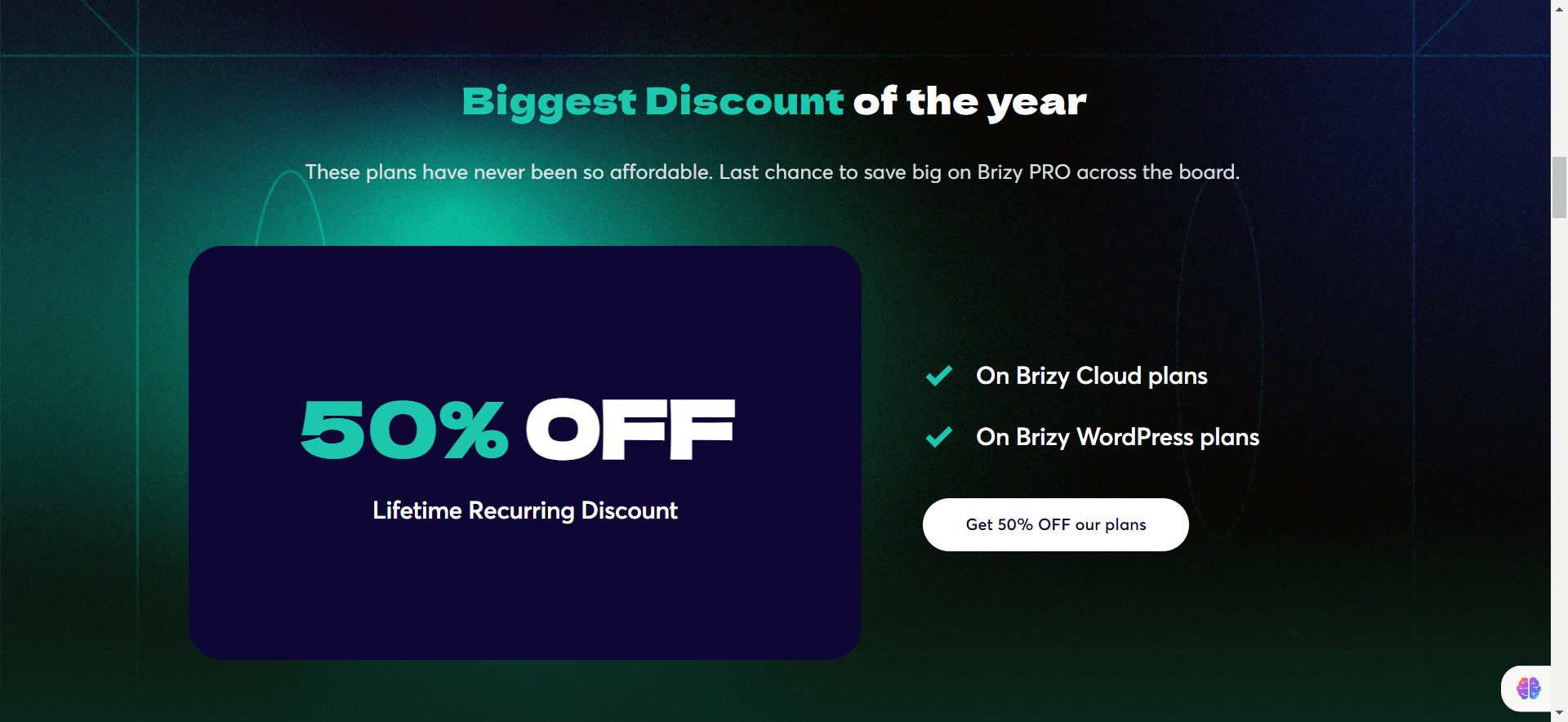 - A lifetime recurring discount of 50% off on Brizy Cloud plans and Brizy WordPress plans.