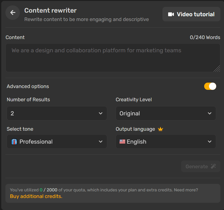 It is a freemium tool that allows users to generate ten daily outputs on the free version, which is not much but can be enough for people who only have to reword content once.