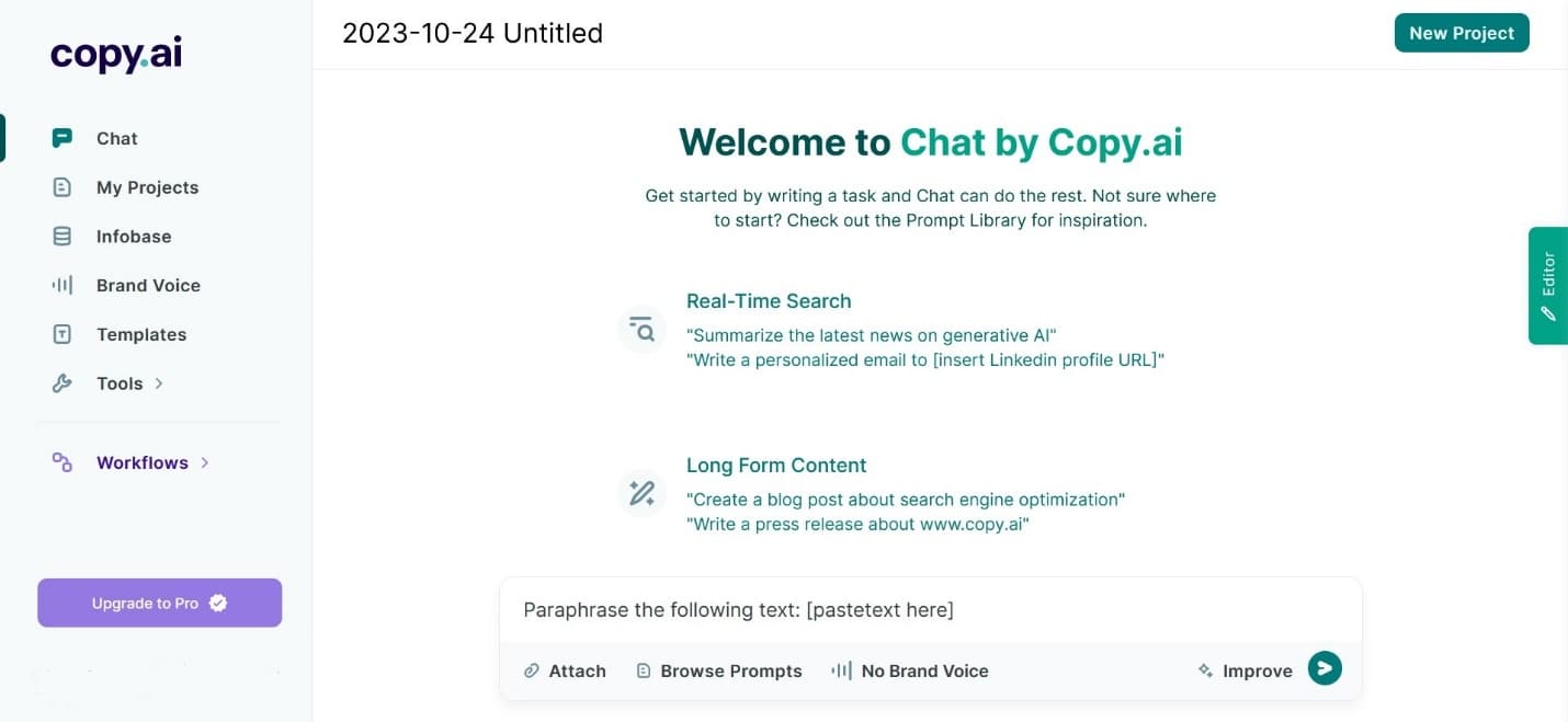 CopyAI is an online platform that provides a whole toolkit for writers. One of its most used and popular tools is Chat by CopyAI. It is essentially a language model that can come up with anything the user wants as long as it’s related to language.