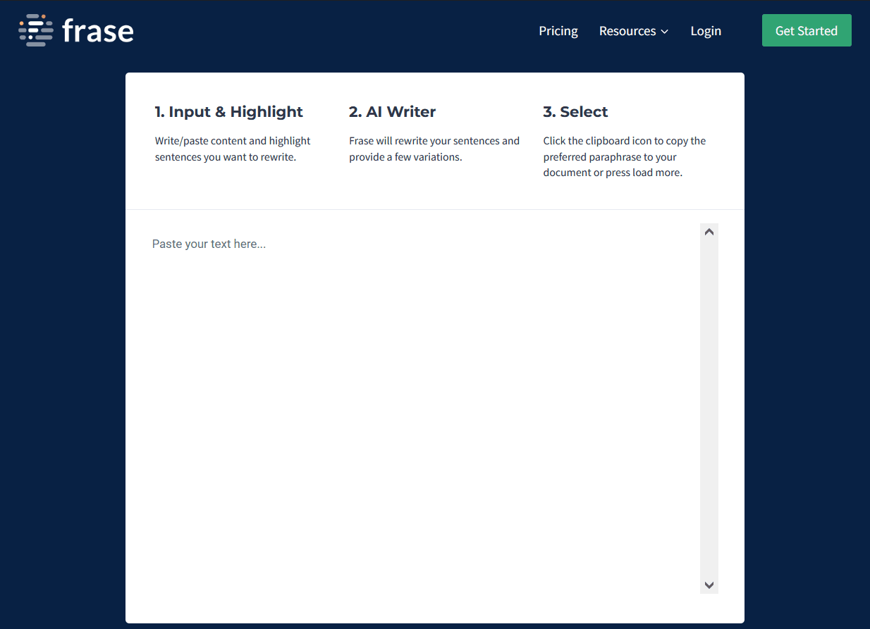 Frase is the largest online platform on this list, offering a variety of tools, including AI writers, paraphrasers, SEO tools, chatbots, content optimization tools, and content editing tools. However, we’ll discuss its paraphrasing tool because it’s the closest thing to a reworder.