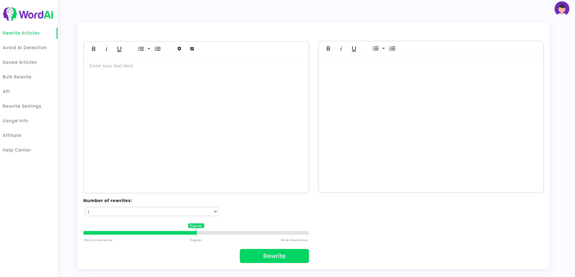 WordAI is an online toolkit that offers two main tools for its users. The first is the article rewriter, and the second is the AI content avoider. The rewriter offered by WordAI can write the entire content you input from scratch to make it better and reword it.
