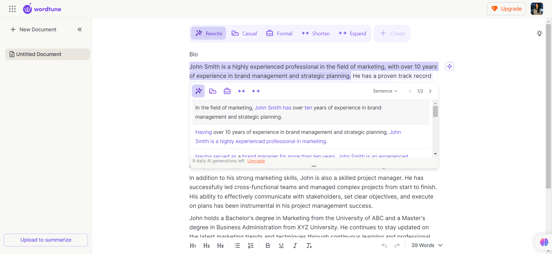 Wordtune is an online text editor that can rewrite, shorten, and expand a piece of content given to it. The tool rewrites content from scratch to increase its quality by changing its words for catchier ones, essentially making it a rewording tool.