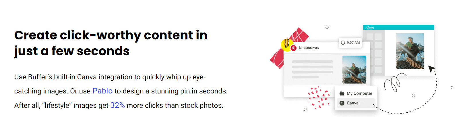- Allows creating pins with Pablo: Buffer also allows you to create Pins using Pablo, its image creation tool.