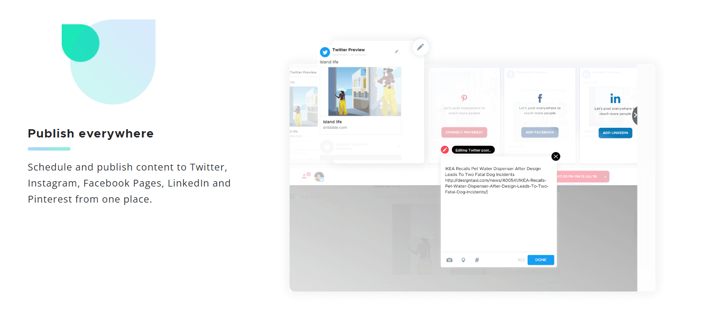 - Cross-platform scheduling: You can schedule and post from any social media account, including Facebook, Instagram, Twitter, and Tumblr.