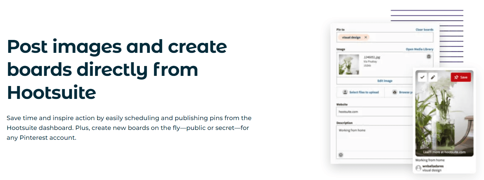 - Cross-platform scheduling: Hootsuite allows you to schedule pins across multiple platforms, including Twitter, Facebook, and LinkedIn.