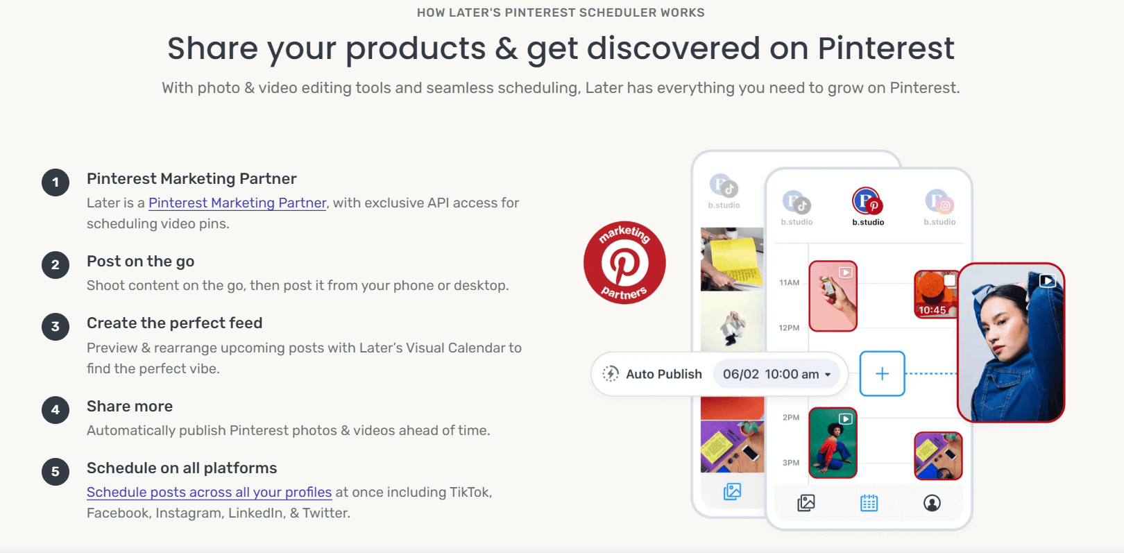 - Official Pinterest partner: Later has access to the same algorithms Pinterest uses when deciding which posts show up in our feeds. They use this knowledge to optimize the scheduling process for maximum effectiveness and efficiency.