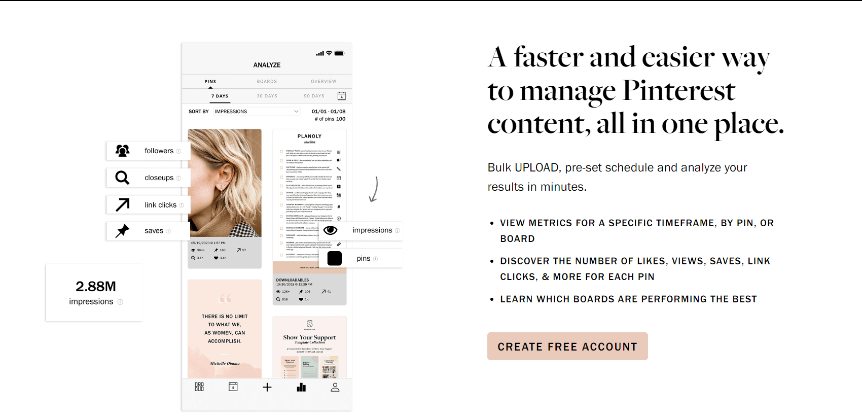 - Scheduling and analytics: Planoly provides powerful scheduling and analytics tools to help you understand how your Pinterest content is performing and make data-driven decisions about your strategy.