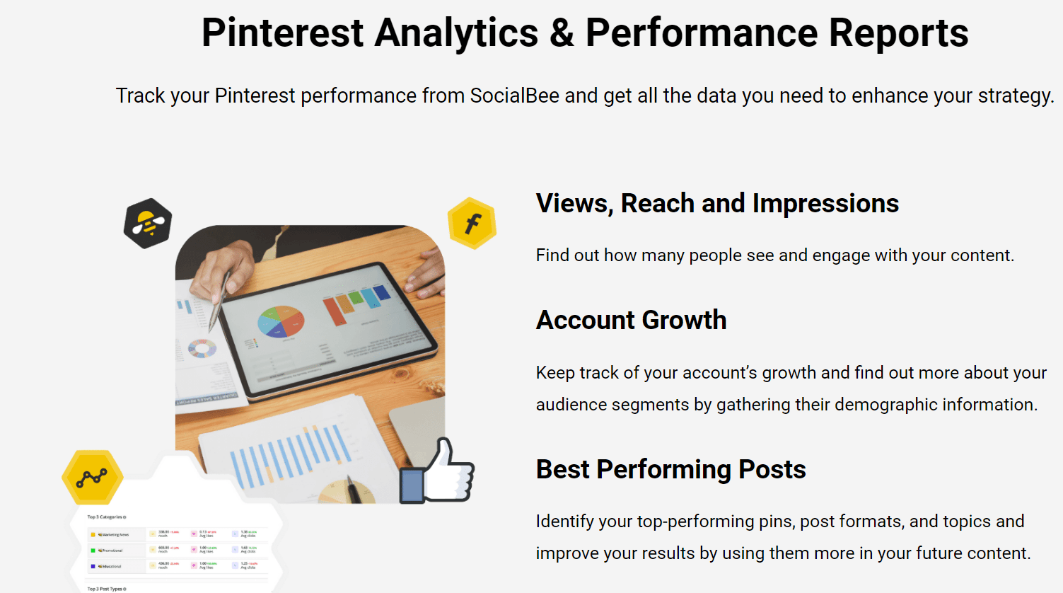 - Analytics: SocialBee provides analytics to help you track the performance of your Pinterest posts. With SocialBee’s analytics, you can get insights into the number of views and clicks your posts receive, which can help you optimize your content for better results.