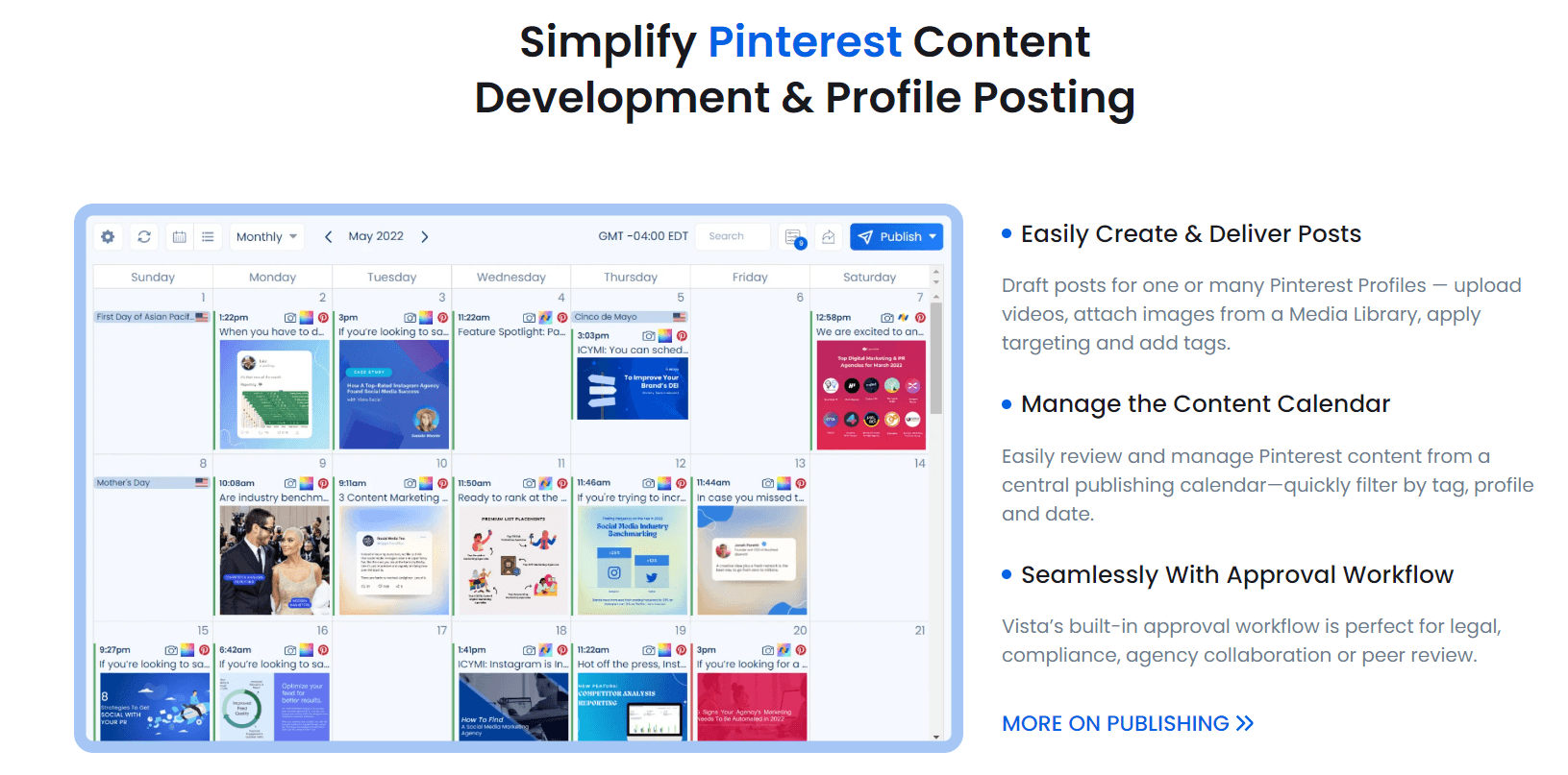 Vista Social is a top-rated tool on G2 that helps you plan and publish engaging Pinterest posts with a centralized content calendar and creative tools. It also has intuitive workflows to make it easier to stay organized and keep your content consistent and on-brand. Overall, Vista Social is a reliable choice for managing your Pinterest presence.